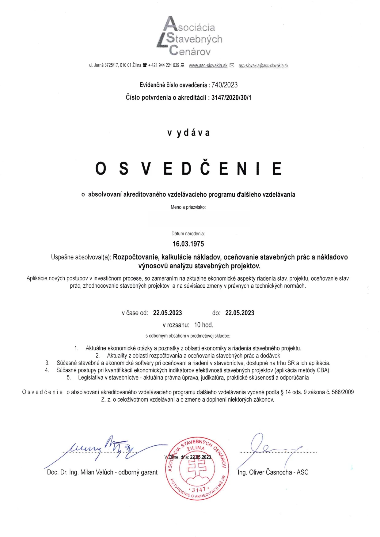 Potvrdenie o absolvovaní odborného kurzu zameraného na vypracovanie stavebných rozpočtov, výkazov výmer a cenových kalkulácií podľa platných noriem.